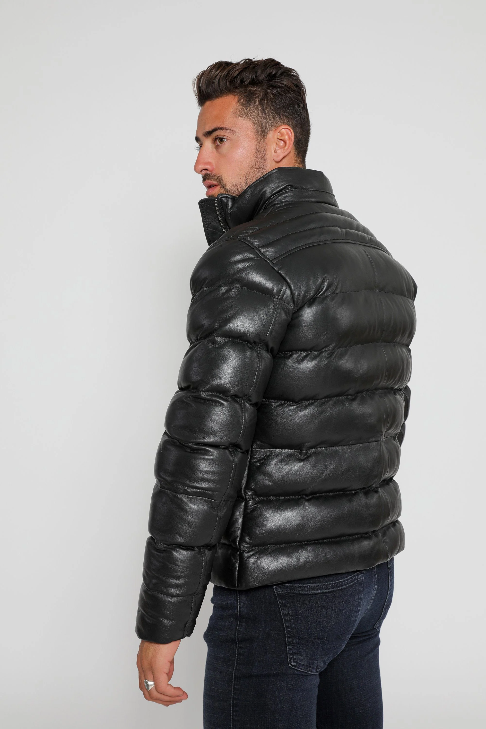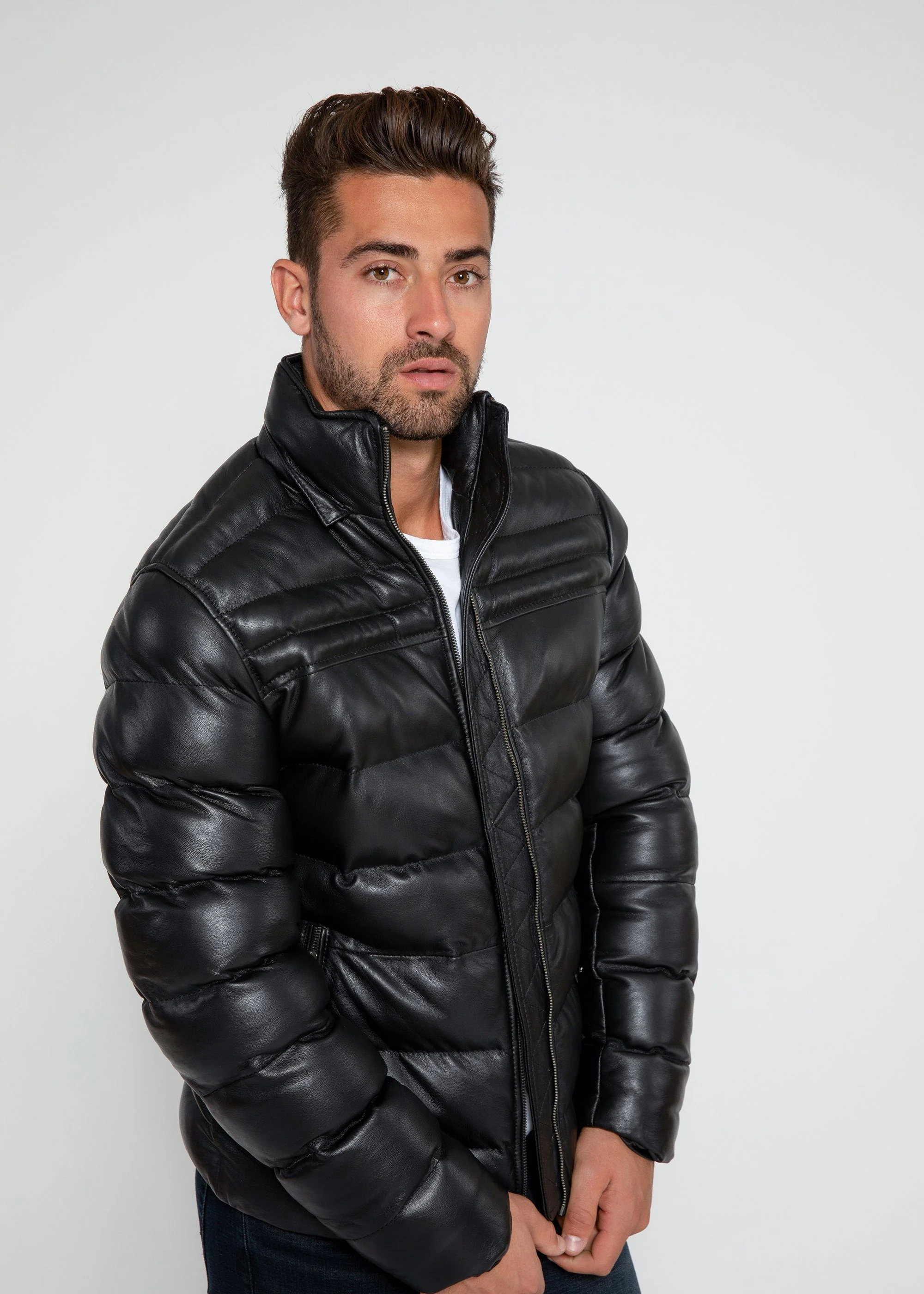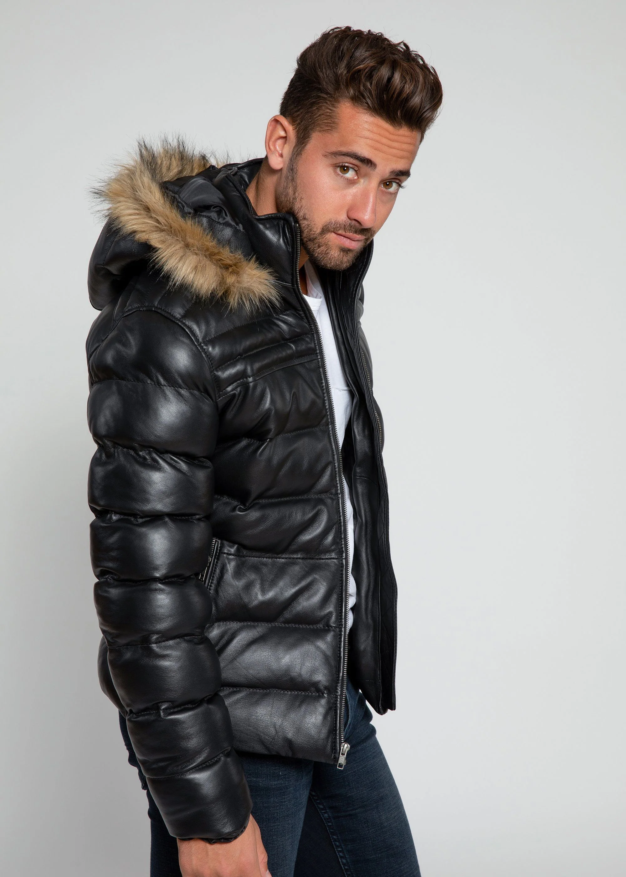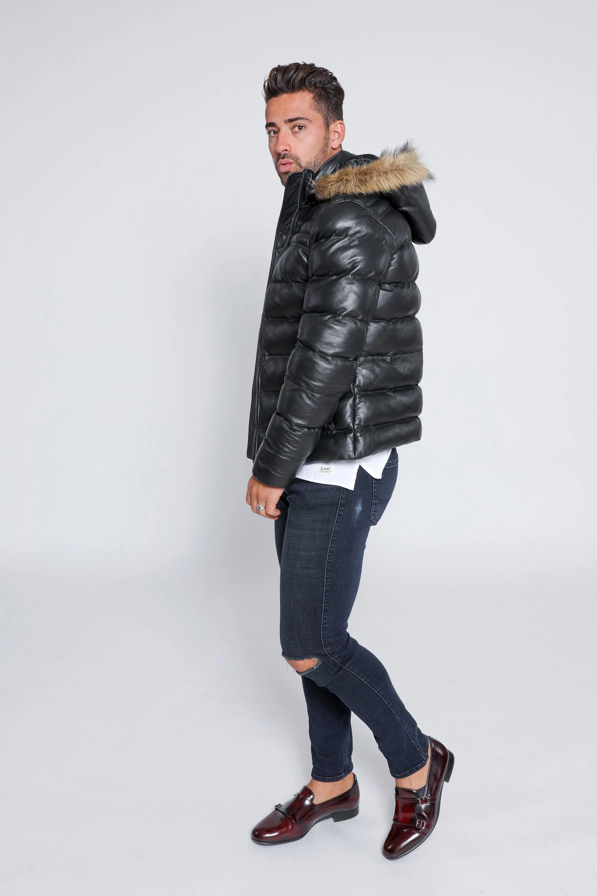 Men's Winter Black Puffer Real Leather Jacket with artificial down.  Made with Ultra Premium 100% Real Soft and Supple Lambskin Leather. Mid-Length Jacket with Fur lining on hoodie. Detachable Hoodie by Zipper. Filled with artificial down in for cold weather protection.  Great for jacket for casual and party wear.