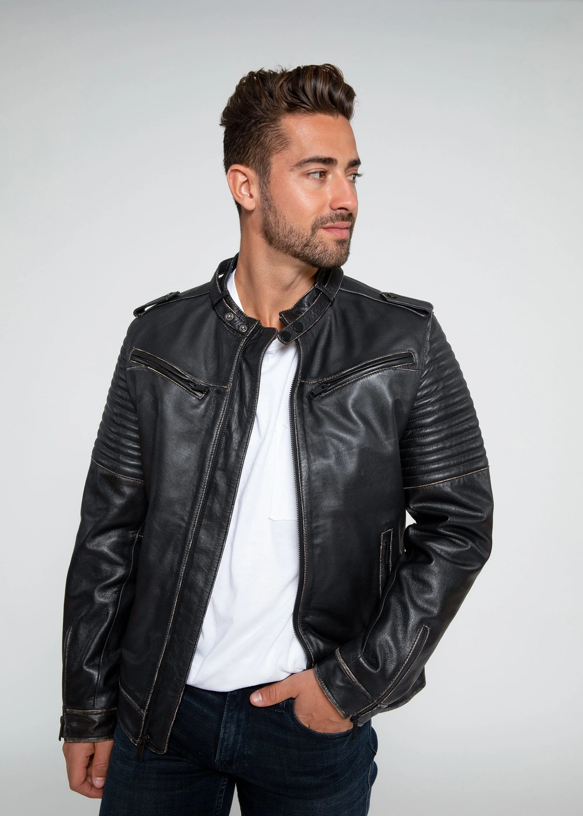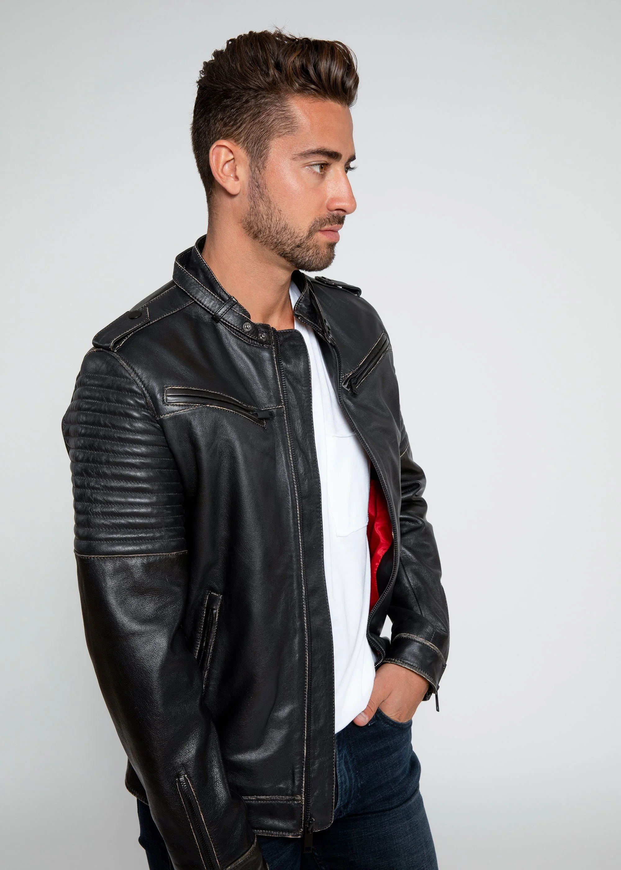 Get in your bold look with the Men's Stark Distressed Leather Jacket. Fully lined red polyester inside with leather outer shell. 2 front pockets and 2 inner pockets.