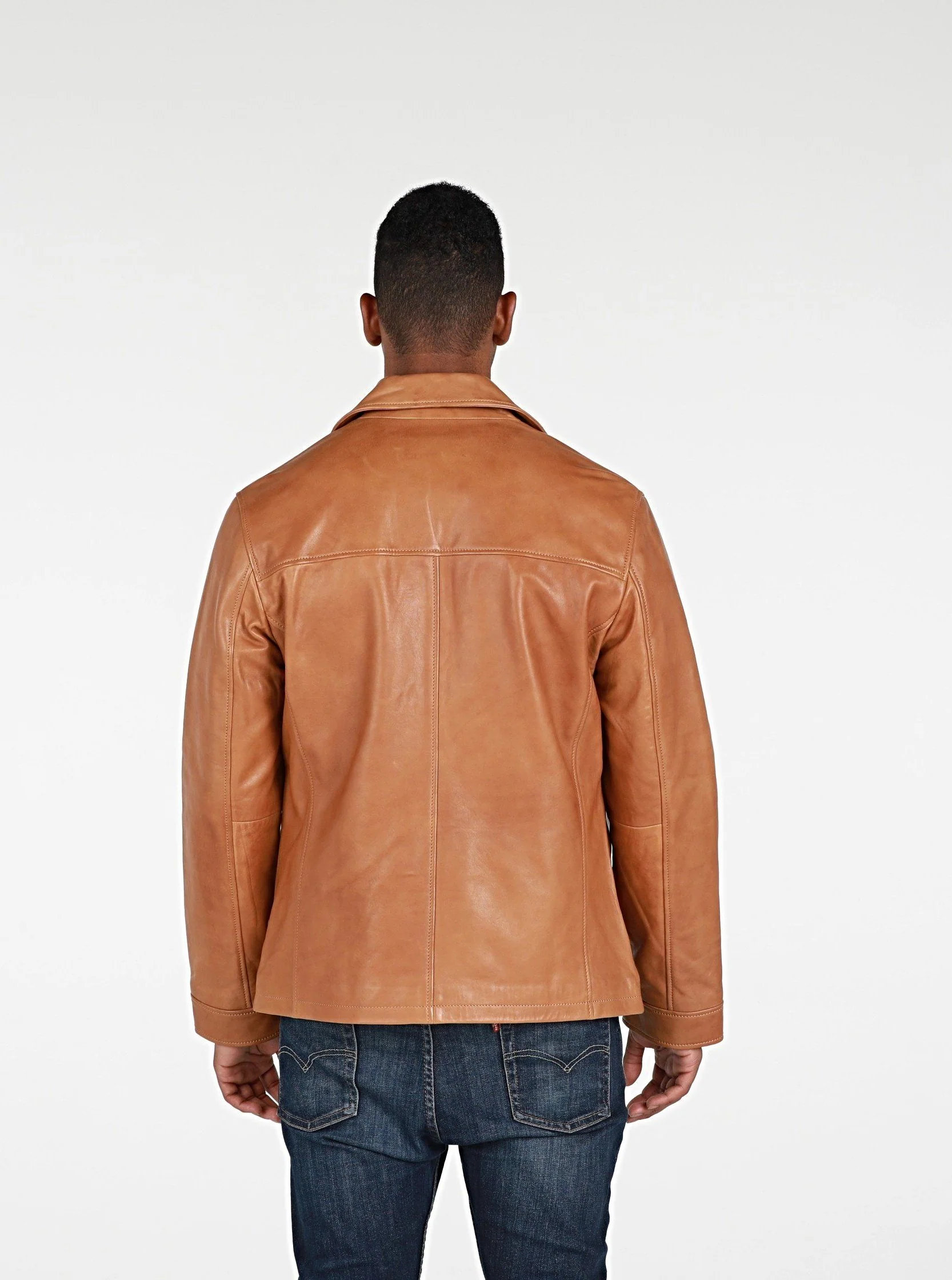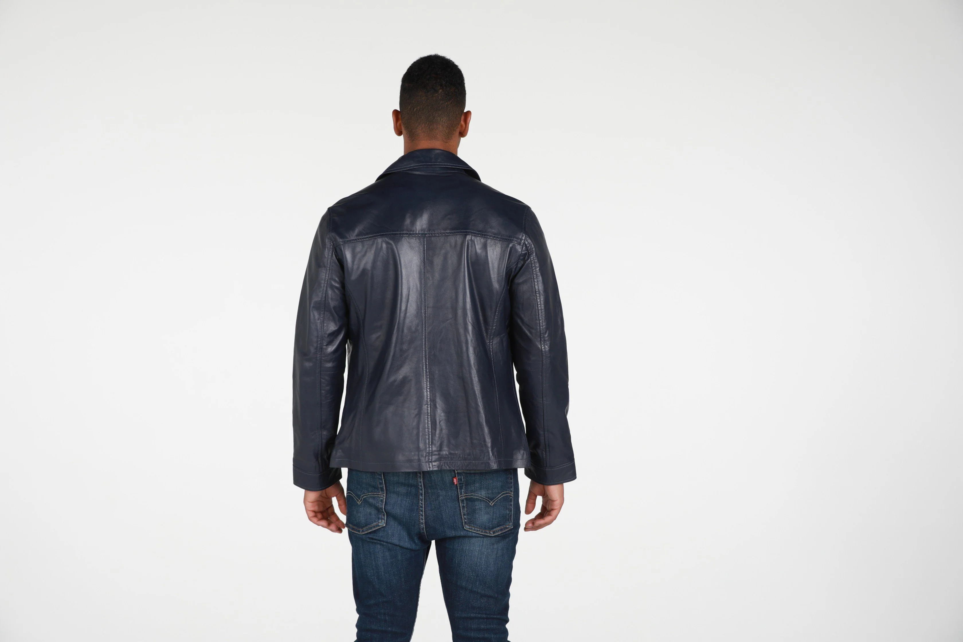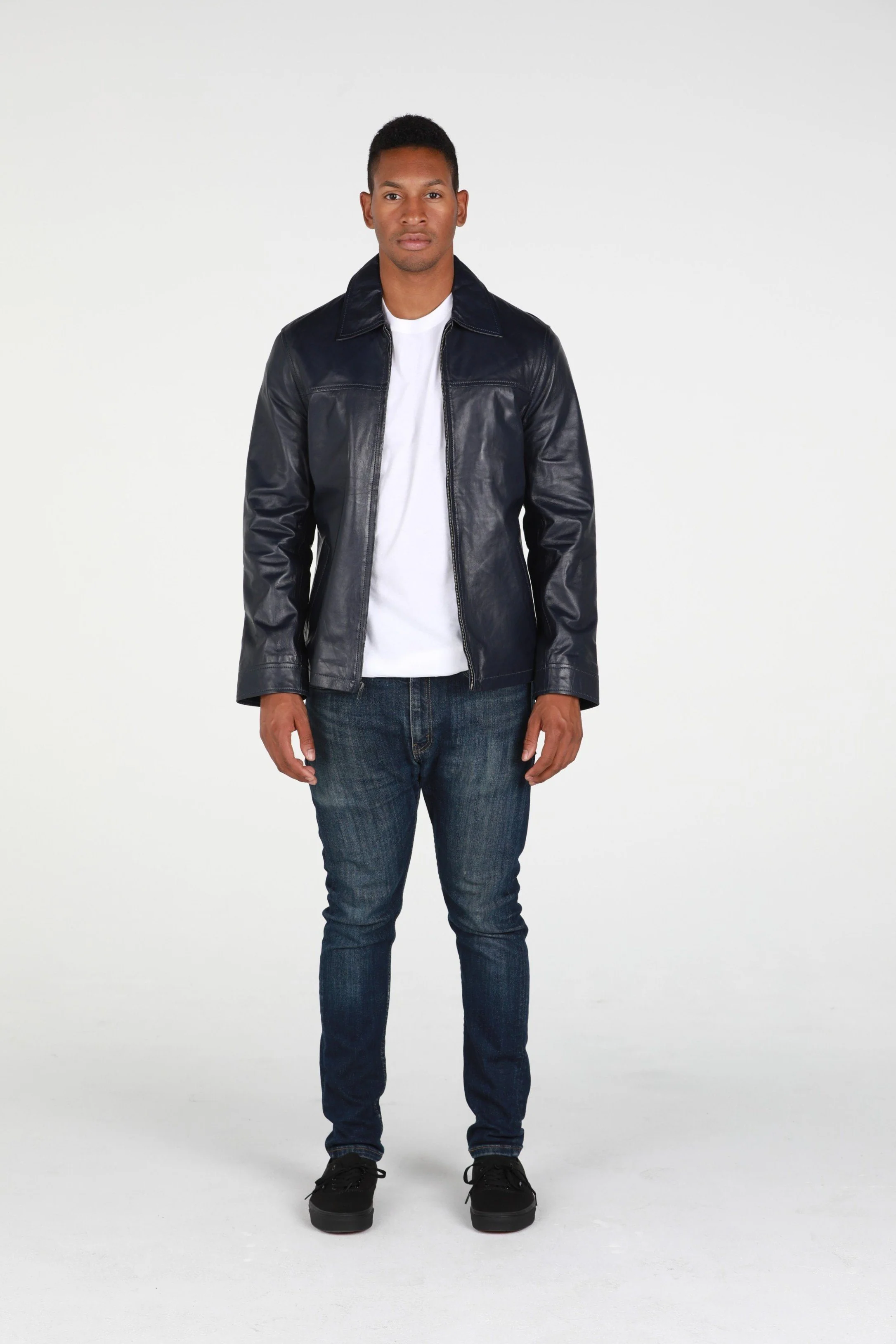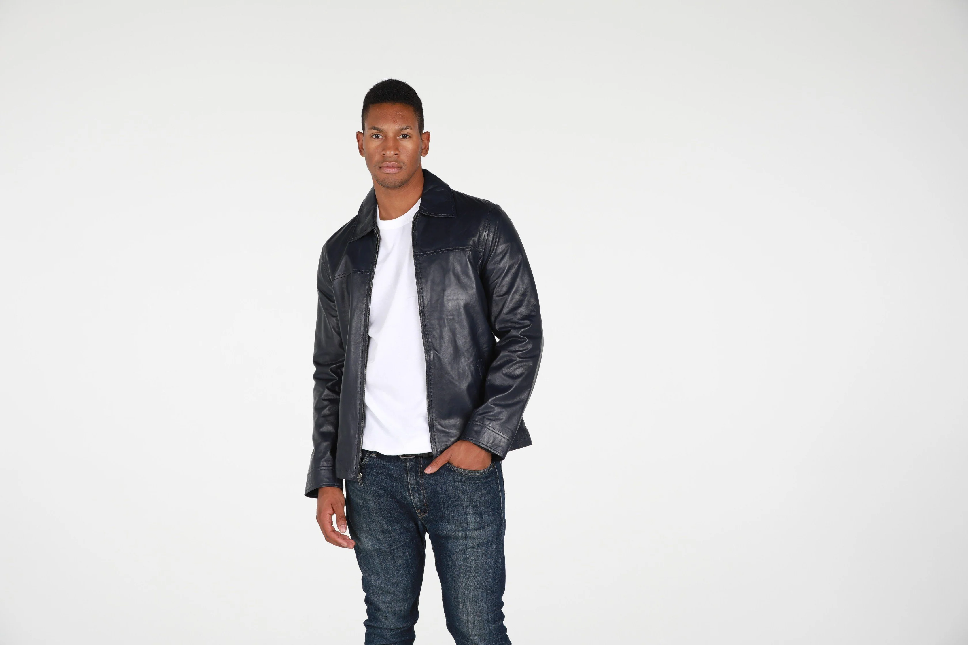 This Abbyse Mens leather jacket is made with soft and supple lambskin leather. Contemporary Mens leather jacket with straight collar, two pockets and zipper. Available in saddle tan brown color and midnight blue.