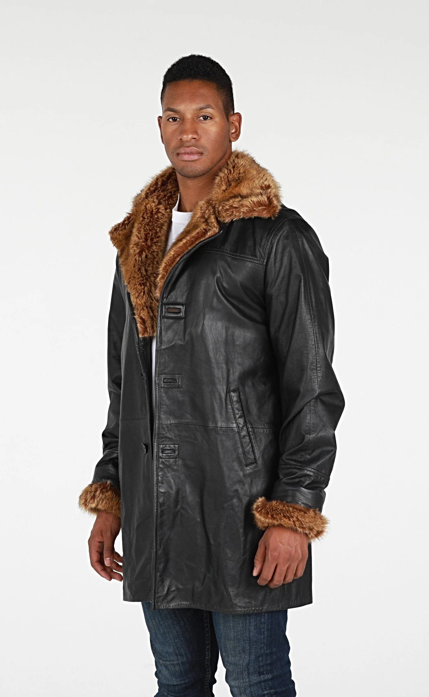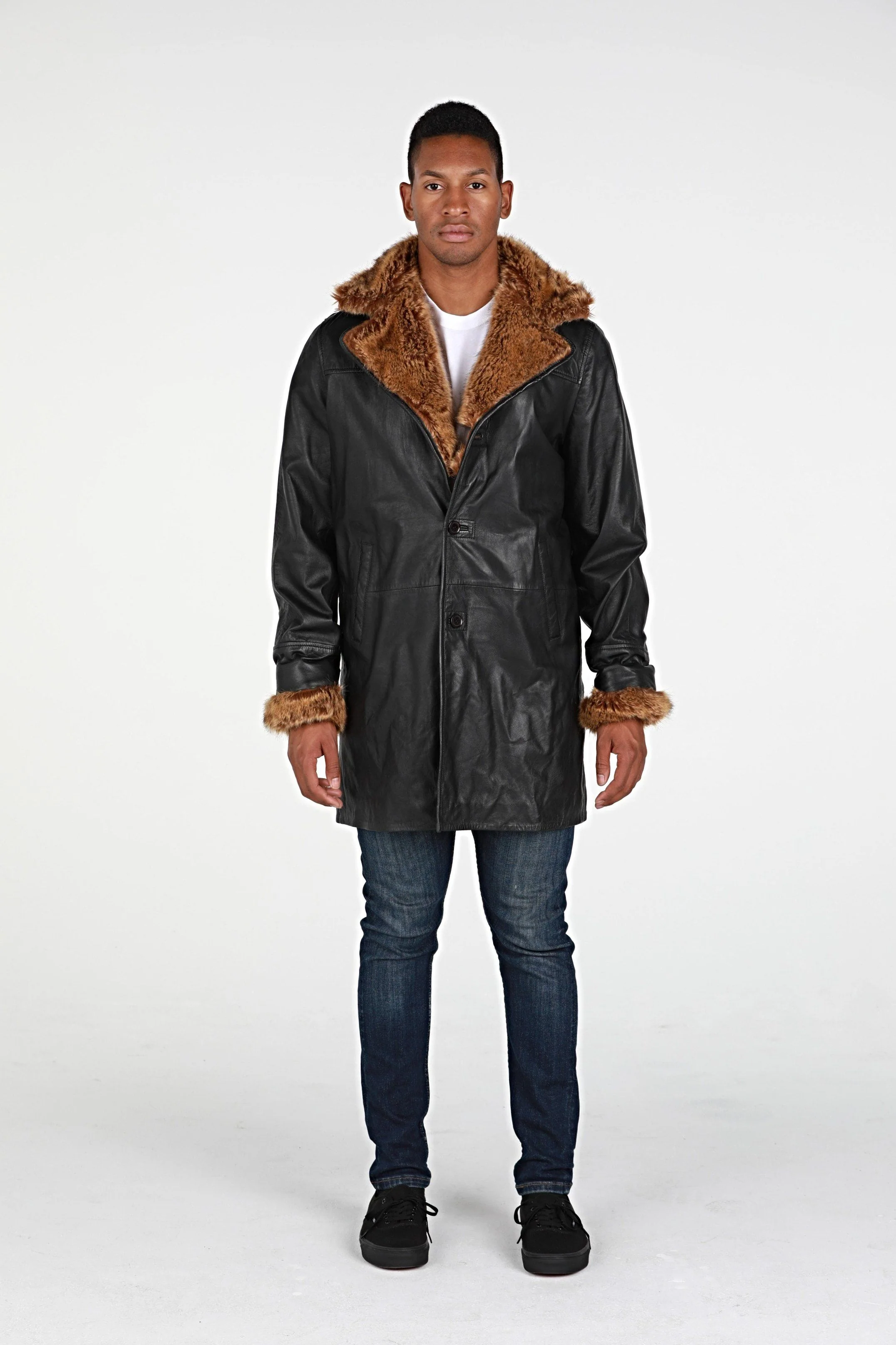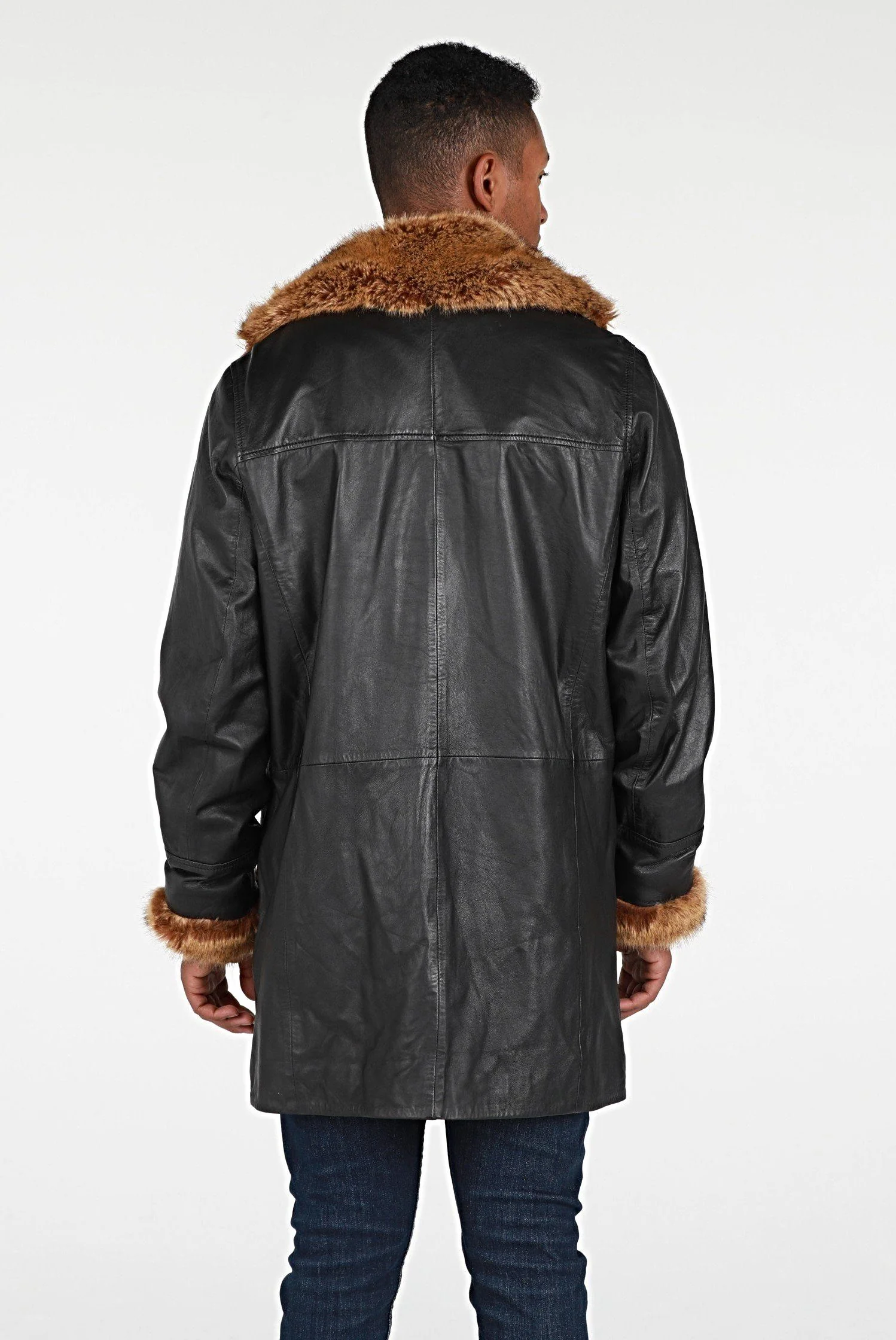 Mens Winter leather coat. This mens leather is a button-up coat with two side pockets. Anthracite neck color. Faux fur collar and at cuffs with satin lining. Soft, supple lambskin leather. Made with 100% genuine leather.