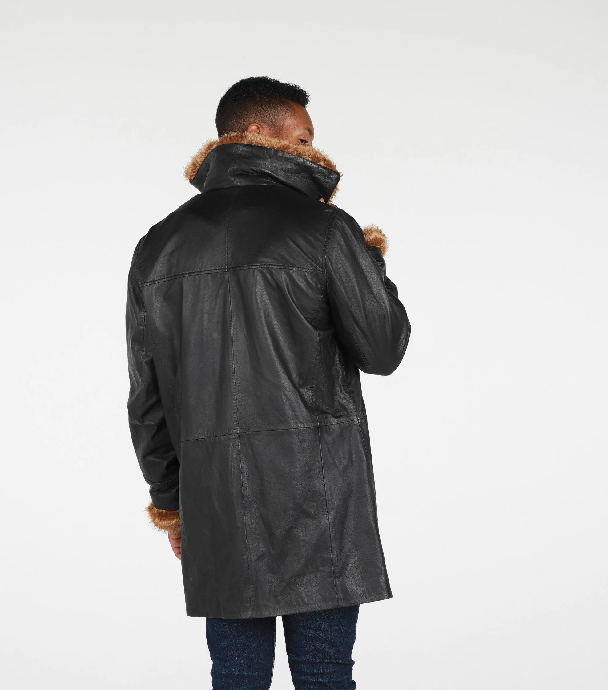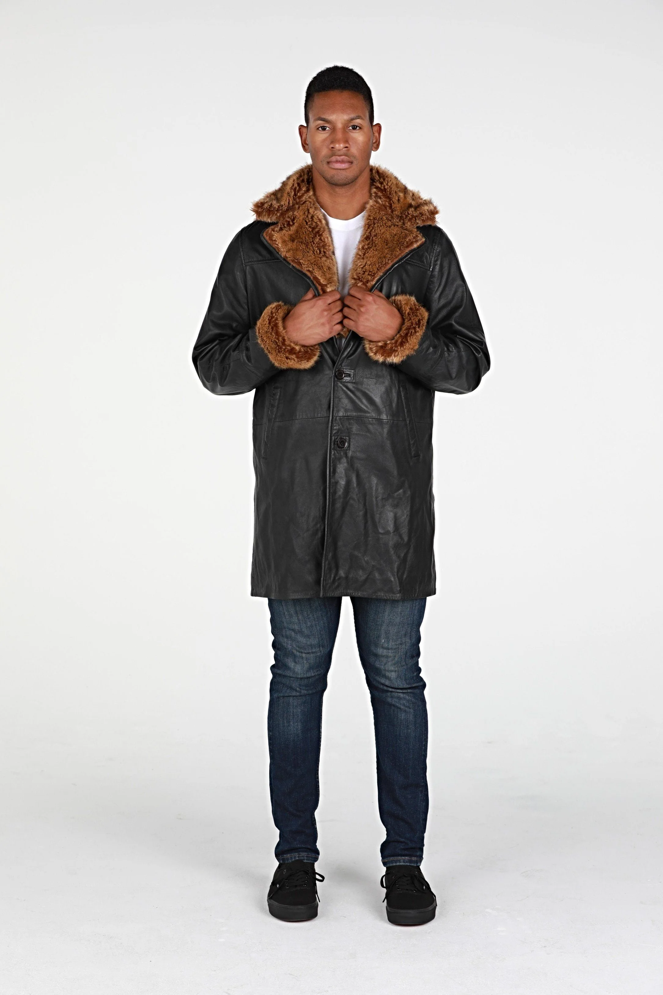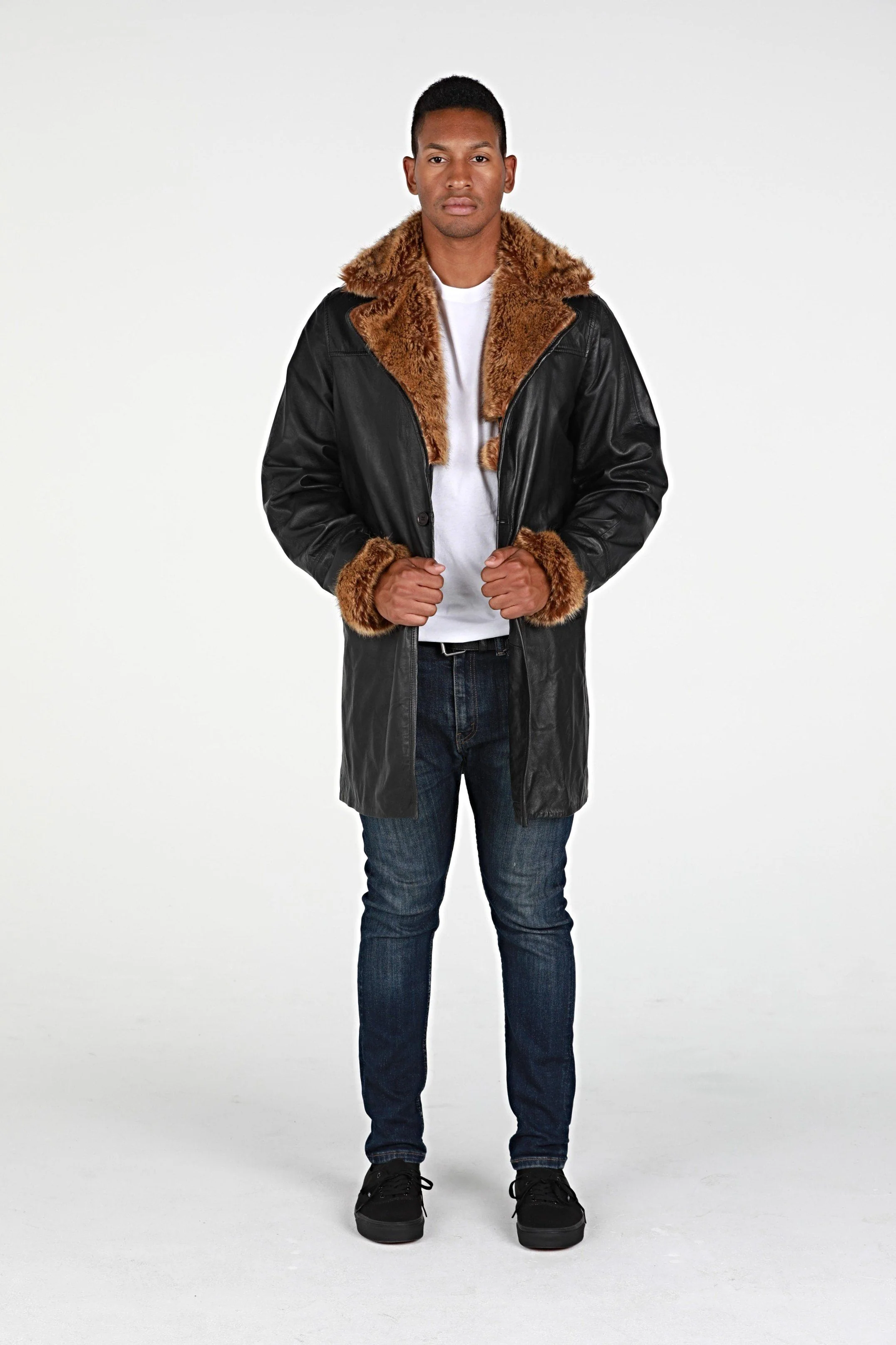 Mens Winter leather coat. This mens leather is a button-up coat with two side pockets. Anthracite neck color. Faux fur collar and at cuffs with satin lining. Soft, supple lambskin leather. Made with 100% genuine leather.