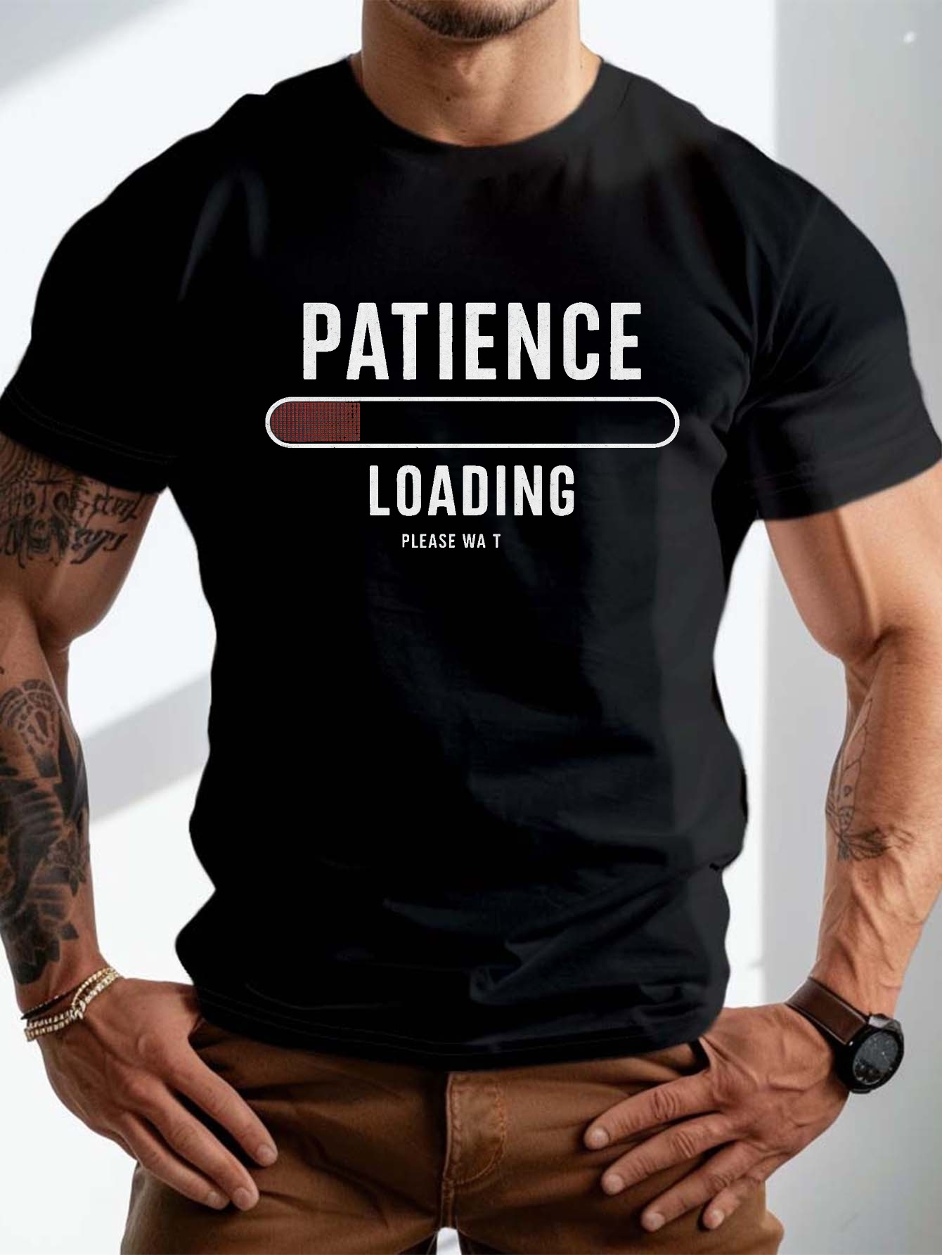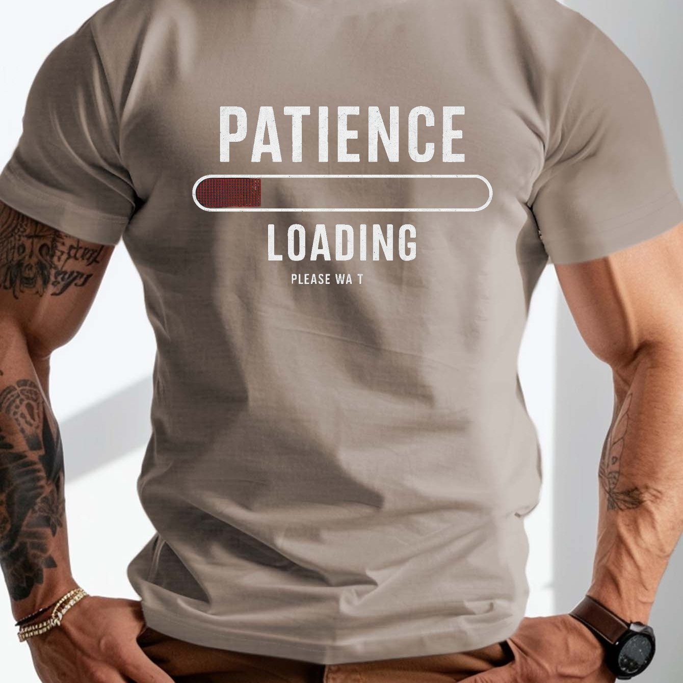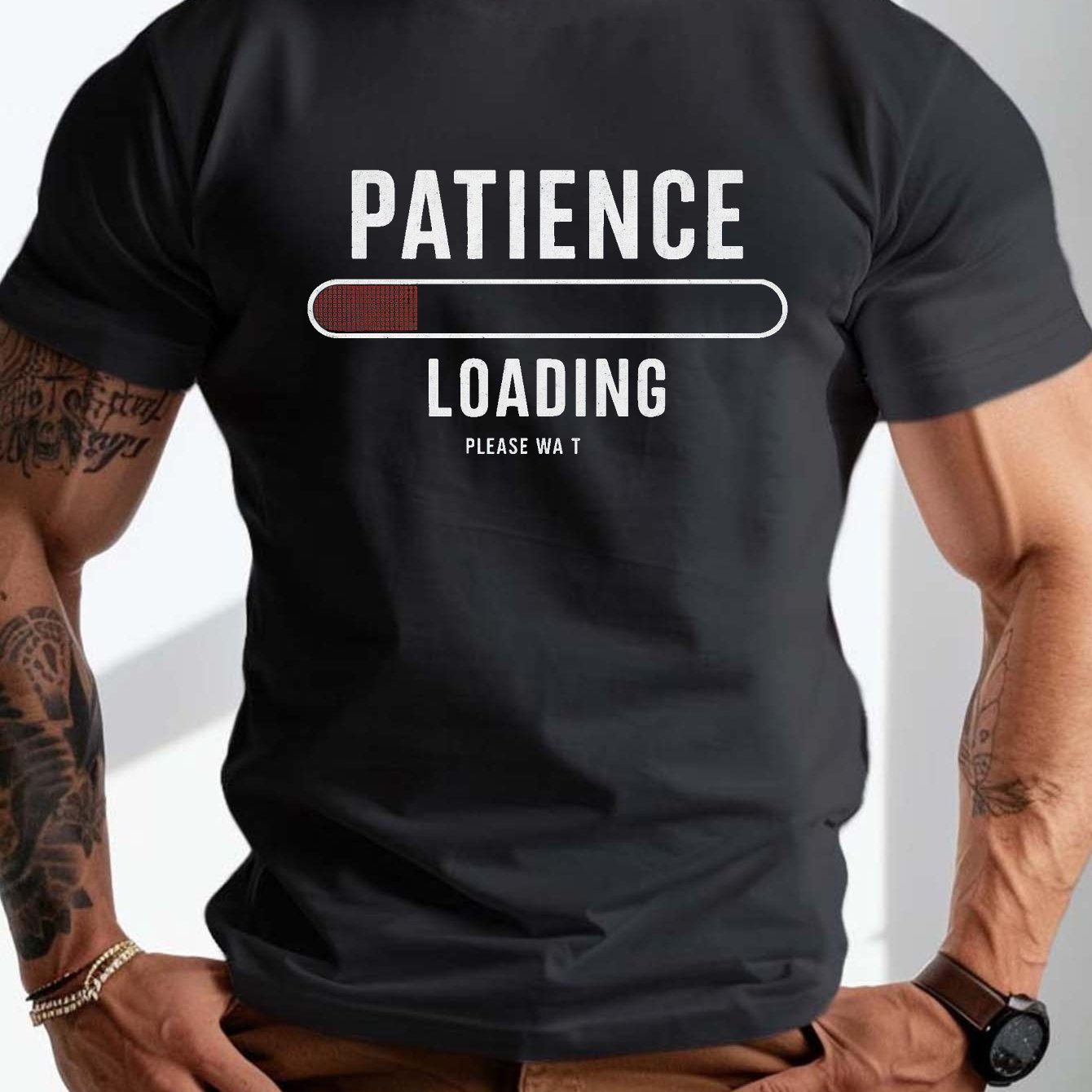 • plus size men's summer t-shirt, Patience Loading Progress graphic print short sleeve tees trend casual tops for daily life, big & tall guys