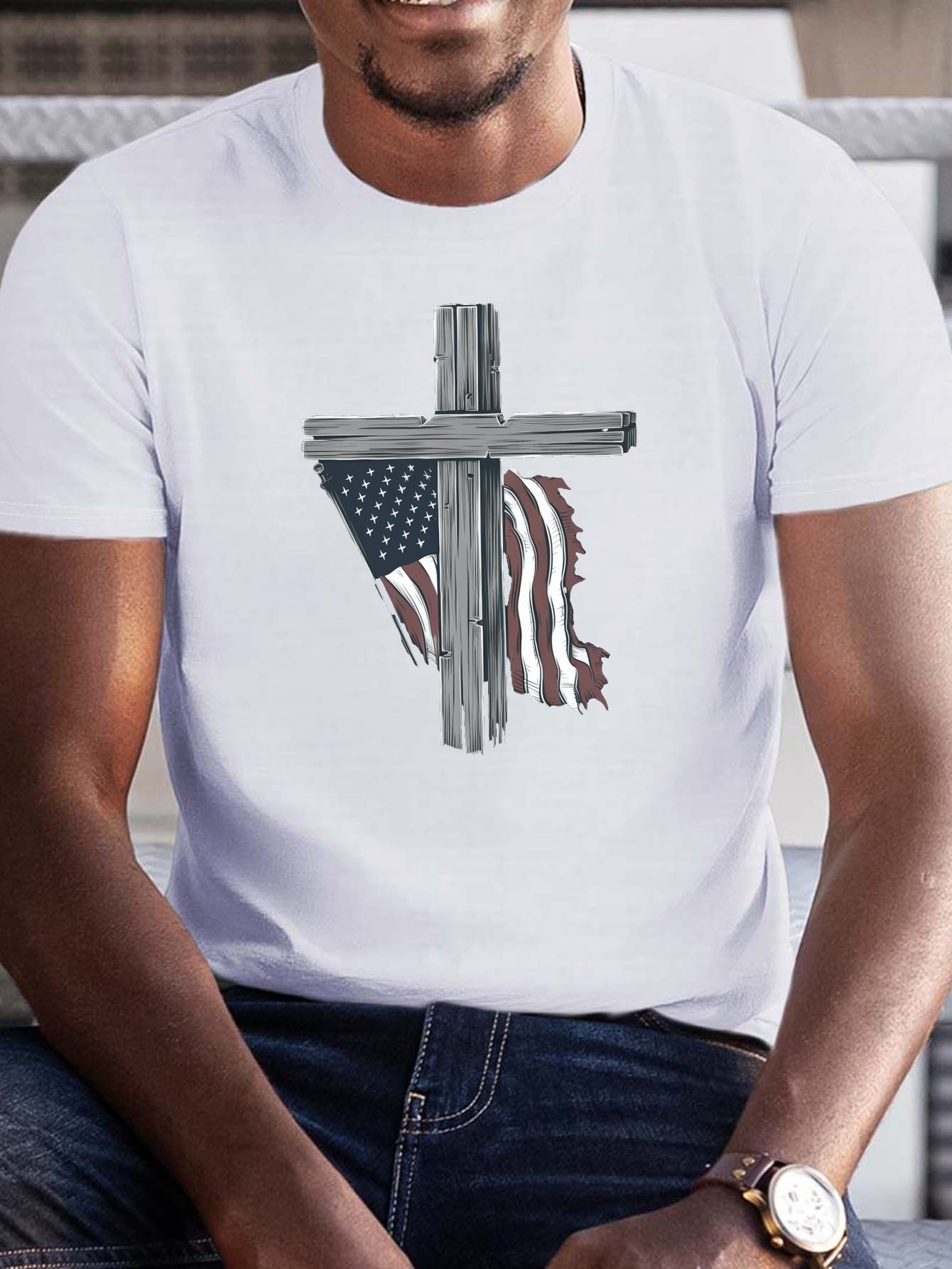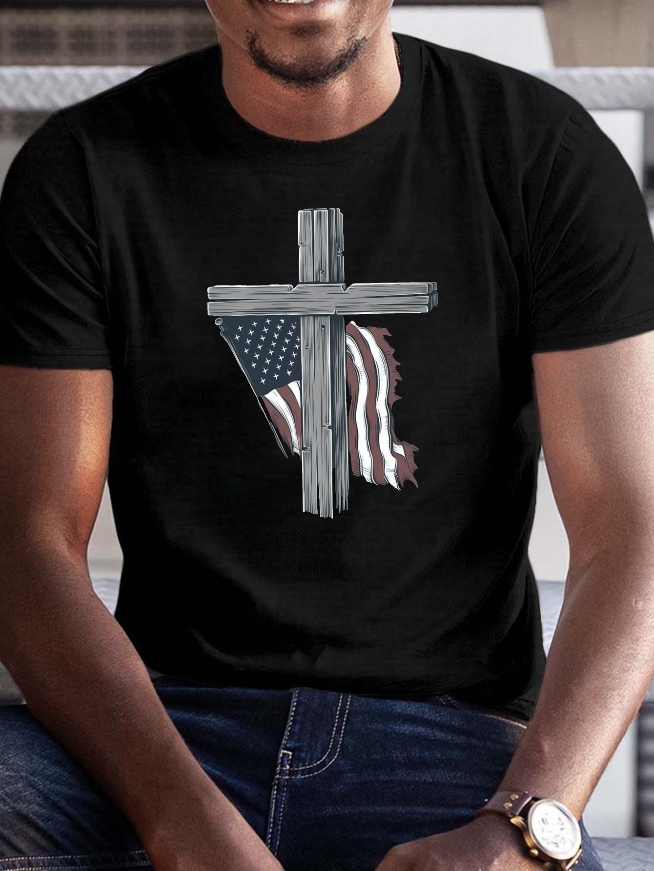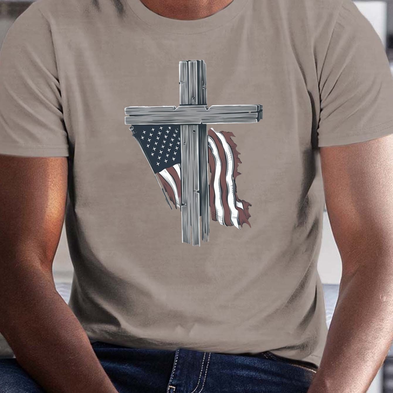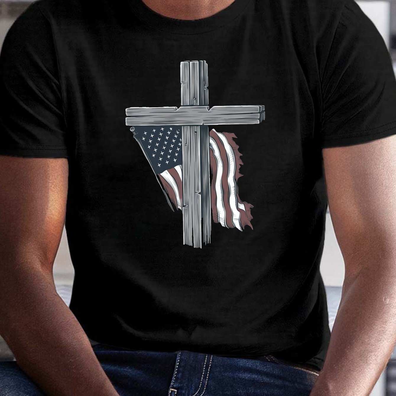 plus size men's summer t-shirt, wooden cross with flag graphic print short sleeve tees trend casual tops for daily life, big & tall guys